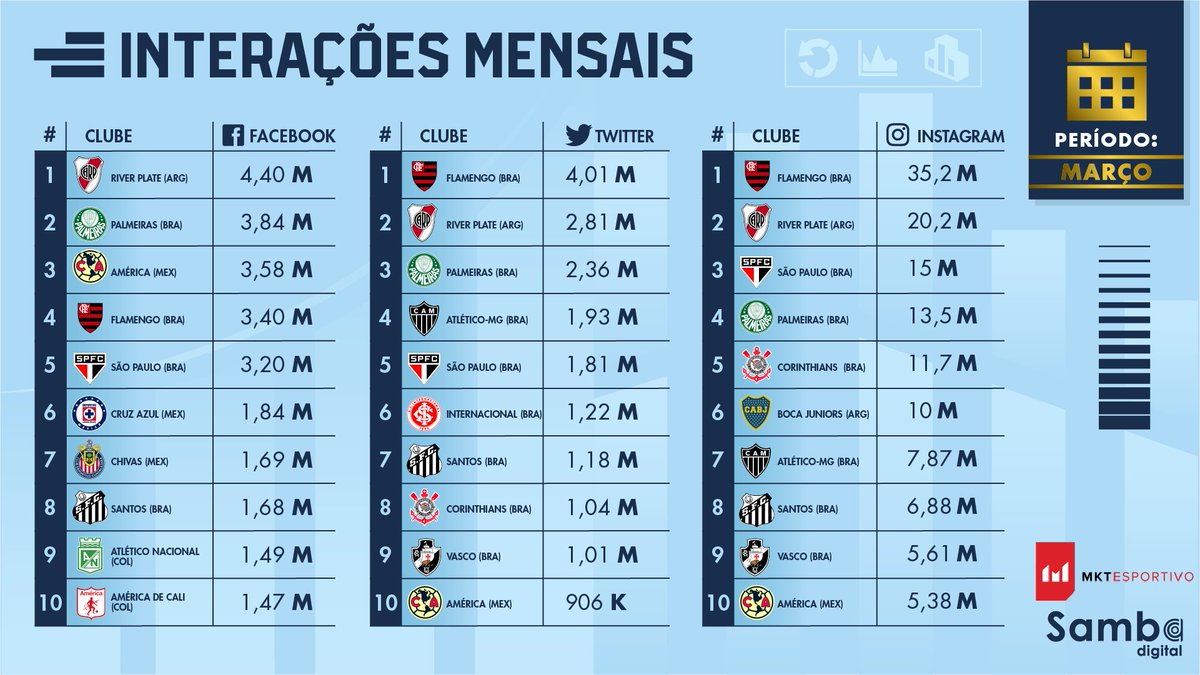O @RiverPlate saiu de 16 milhões de interações no Instagram em janeiro, para 18 milhões em fevereiro e manteve a linha de crescimento em março, com 20 milhões.