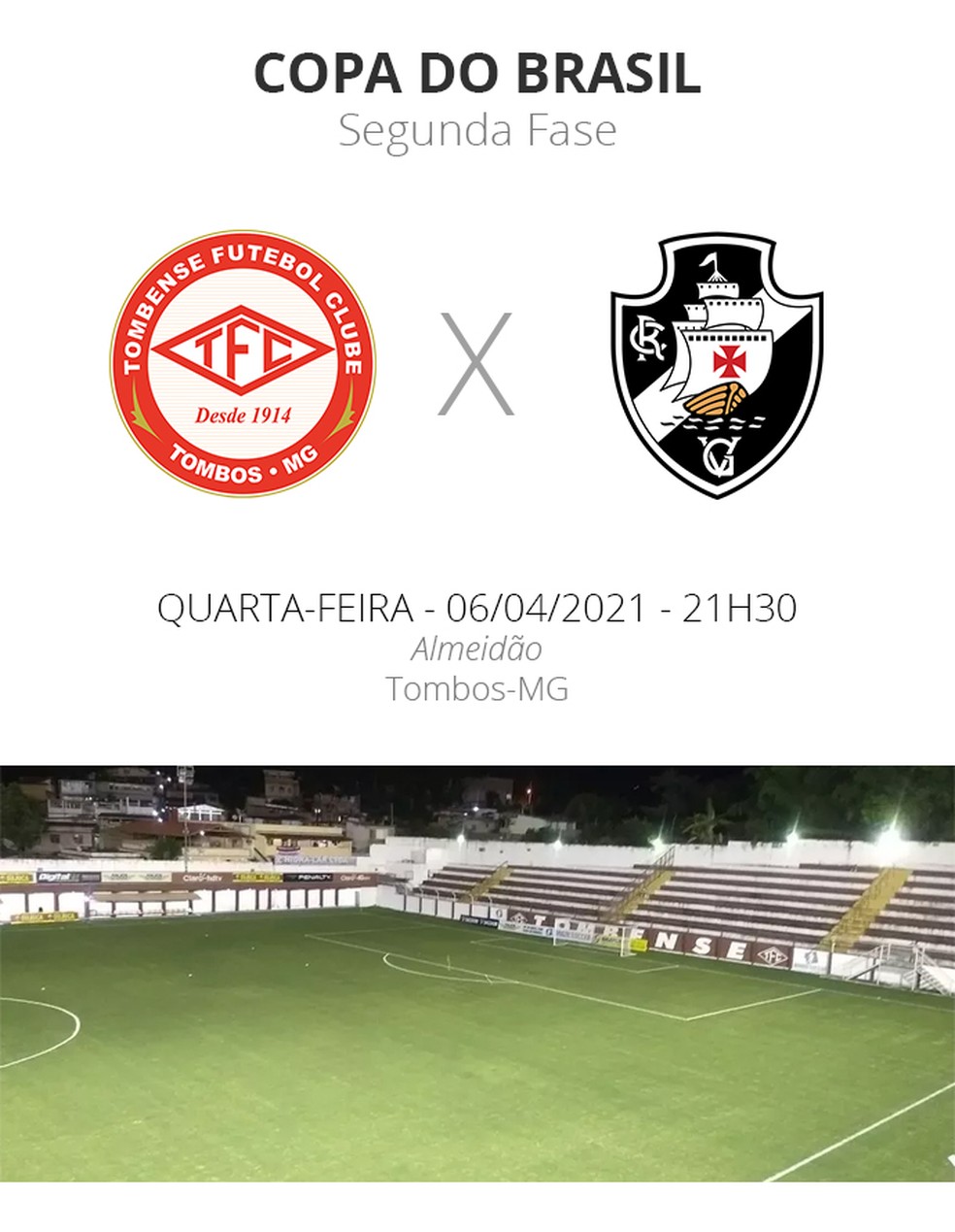 A quarta-feira é de decisão para Tombense e Vasco na Copa do Brasil. As equipes entram em campo no Almeidão, em Tombos, a partir das 21h30, em jogo único, válido pela segunda fase da competição nacional.