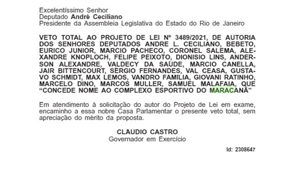 O governador em exercício do Rio, Cláudio Castro, vetou a mudança de nome do estádio de Maracanã nesta quinta-feira. A decisão foi publicada no diário oficial do estado pela manhã. A proposta era para substituir Estádio Jornalista Mário Filho por Estádio Edson Arantes do Nascimento - Rei Pelé.