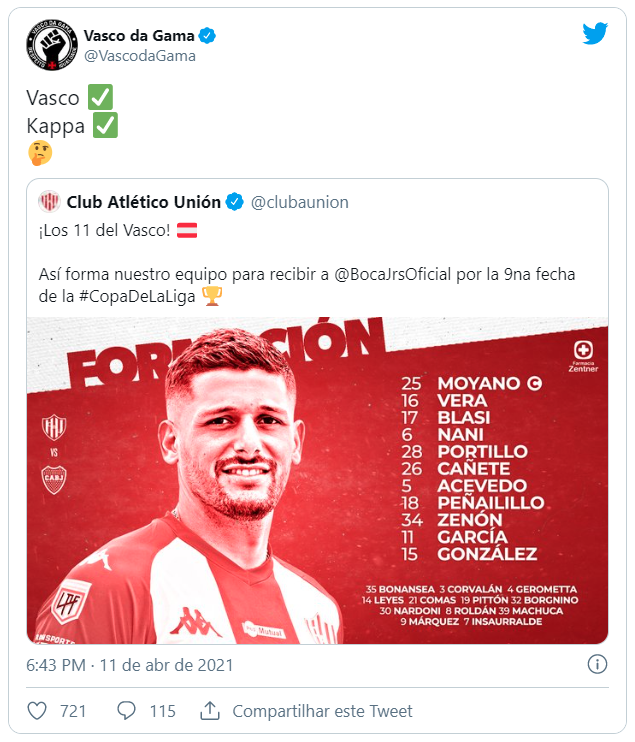 Vasco replica postagem do Unión Santa Fé-ARG, que usa Kappa e cujo técnico tem o apelido de Vasco