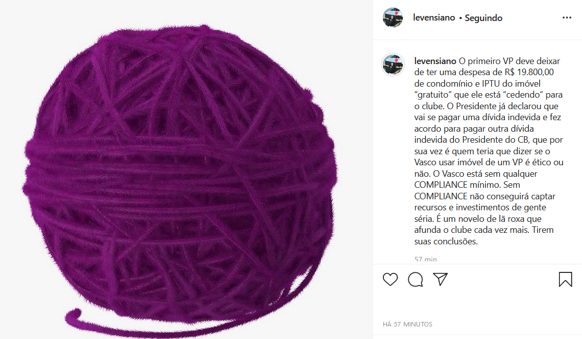 O primeiro VP deve deixar de ter uma despesa de R$ 19.800,00 de condomínio e IPTU do imóvel "gratuito" que ele está "cedendo" para o clube. O Presidente já declarou que vai se pagar uma dívida indevida e fez acordo para pagar outra dívida indevida do Presidente do CB, que por sua vez é quem teria que dizer se o Vasco usar imóvel de um VP é ético ou não. O Vasco está sem qualquer COMPLIANCE mínimo. Sem COMPLIANCE não conseguirá captar recursos e investimentos de gente séria. É um novelo de lã roxa que afunda o clube cada vez mais. Tirem suas conclusões.