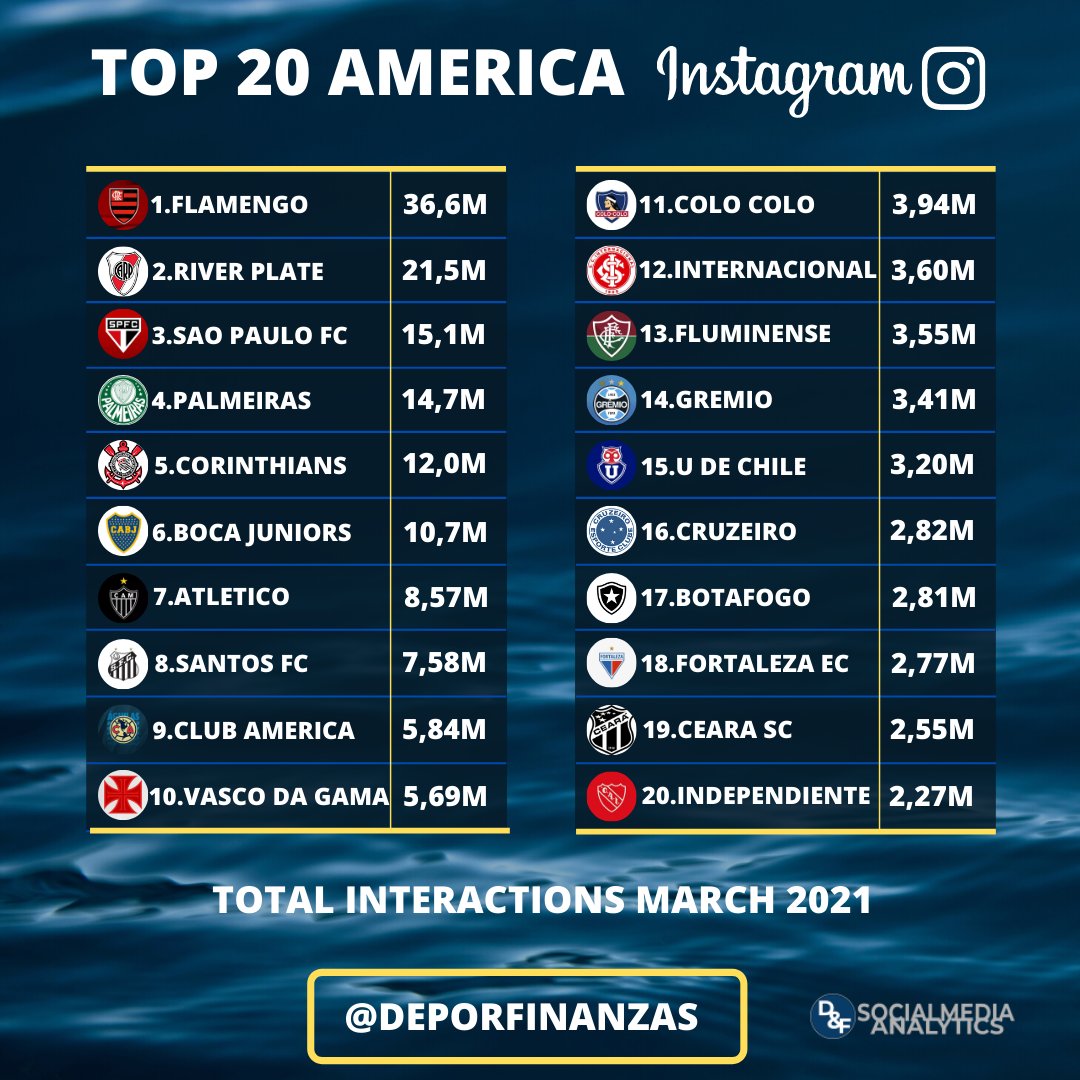 📲⚽ ¡Los 20 clubes de América con más interacciones en #instagram durante marzo 2021! 💙💬