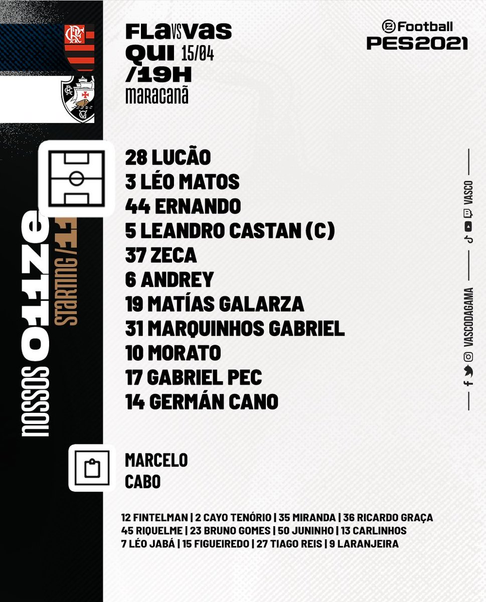 Confira a escalação do Vasco para o jogo contra o Urubu; Marcelo Cabo repete o time