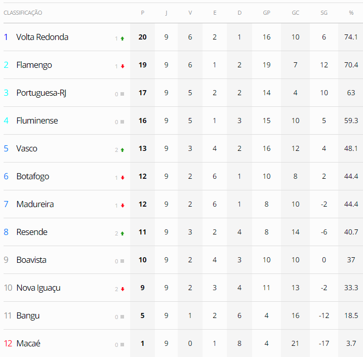 Terminada a 9ª rodada da Taça Guanabara, o Vasco, que venceu o Flamengo por 3 a 1, subiu da 7ª para a 5ª colocação e manteve a diferença de 3 pontos para o G4.