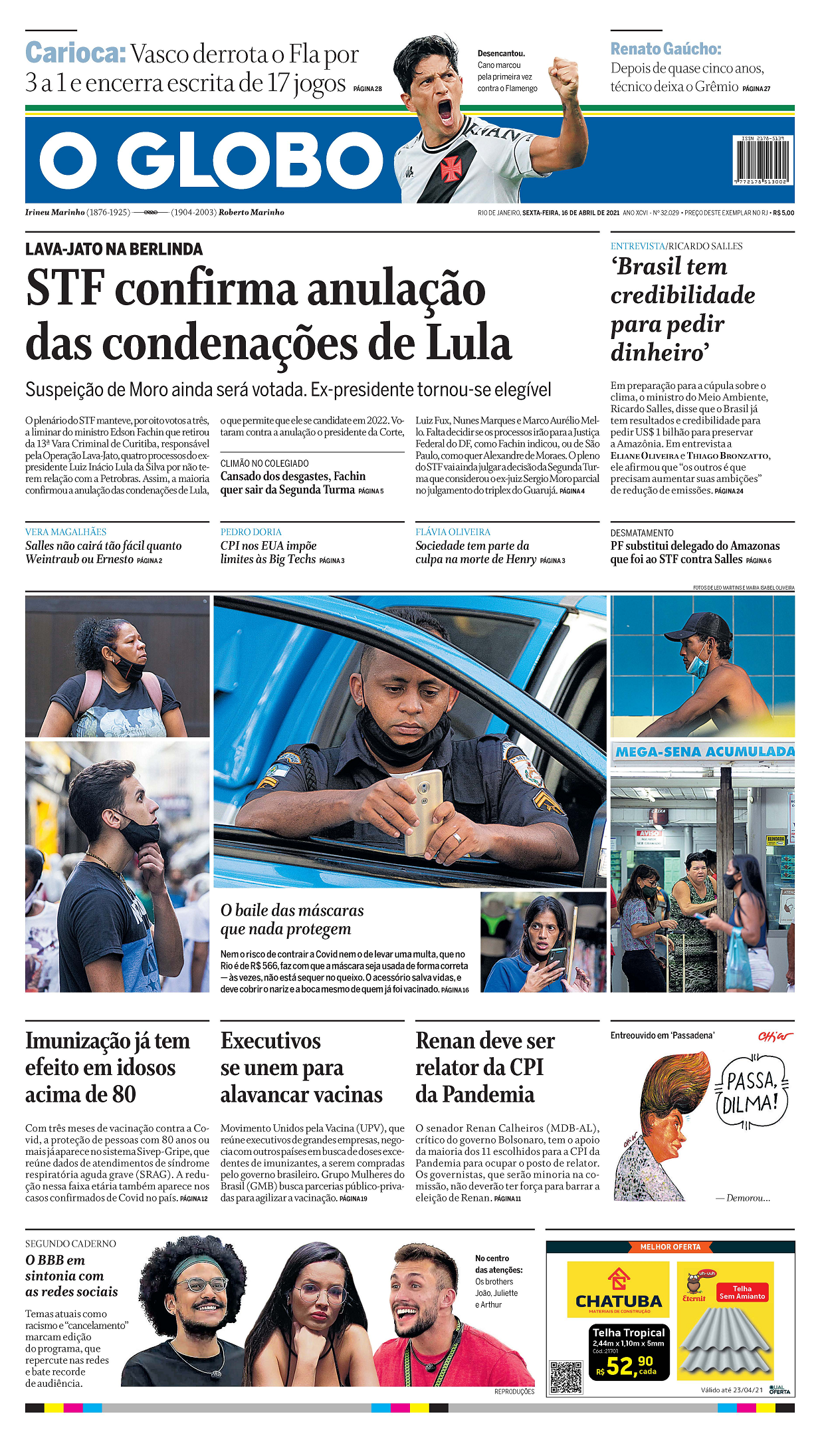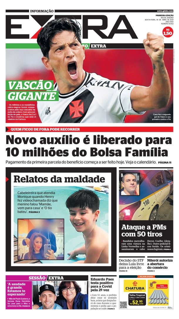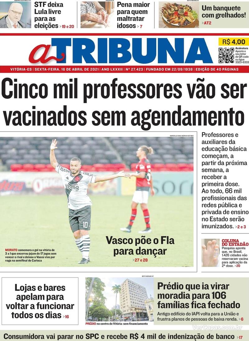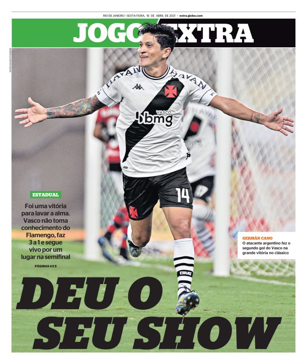 Pelo Campeonato Estadual, o Vasco derrotou o Flamengo por 3 a 1 na noite de 5ª-feira no Maracanã encerrando um jejum de 17 jogos sem vencer o rival. Veja as capas dos jornais