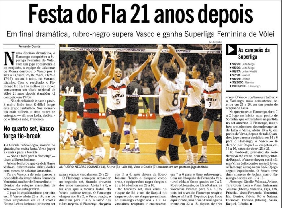 Maracanãzinho, 17 de abril de 2001. Flamengo faz 2 a 1 no Vasco e fica a um set de conquistar a Superliga Feminina. As cruz-maltinas reagem, empatam o jogo e levam a partida ao tie-break. O time da Colina consegue dois match points, mas o Rubro-Negro tem Virna em noite inspirada. Comandado pela ponteira medalhista olímpica, o Flamengo vira o quinto set, vence o jogo e conquista o título diante de um ginásio lotado. Estava escrito ali um dos capítulos mais épicos de uma rivalidade que se estende a várias modalidades.