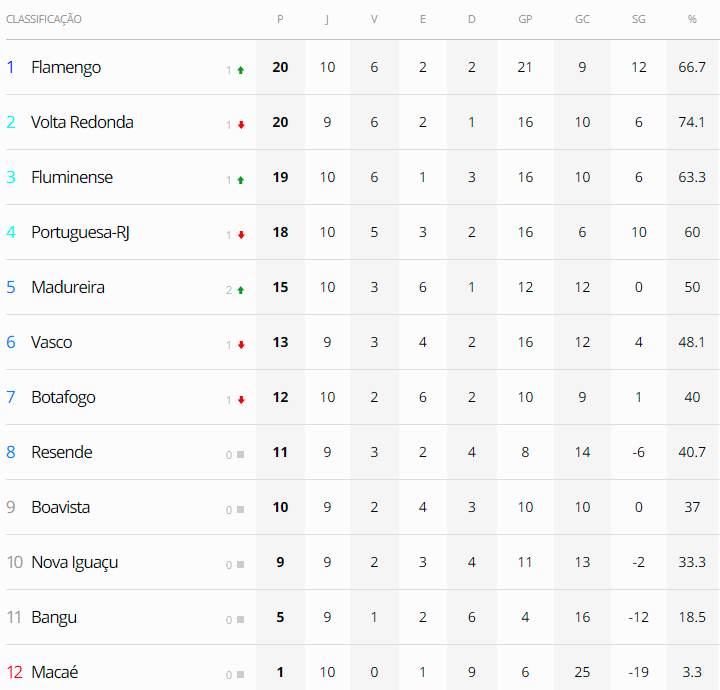 Veja a classificação da Taça Guanabara após os jogos de sábado da 10ª rodada. O Vasco está em 6º lugar.