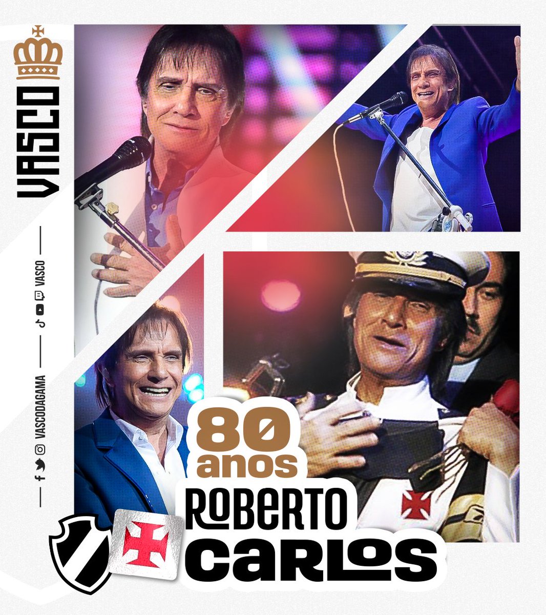 Hoje é dia de celebrar o aniversário de 80 anos do Rei Roberto Carlos. Nunca escondeu o seu amor pelo Vasco da Gama. ❤️?