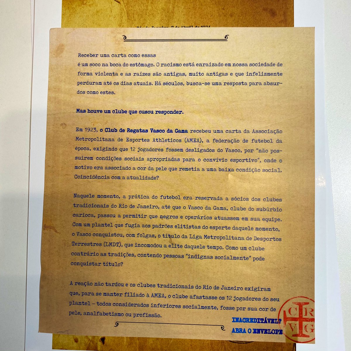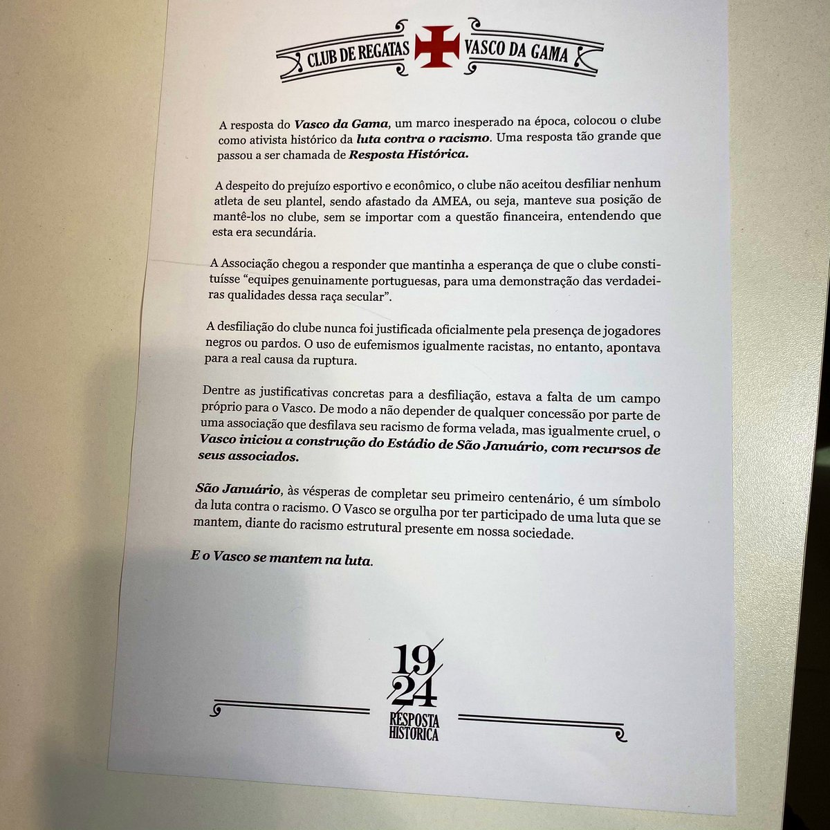 Obrigada @VascodaGama pela carta, pelo uniforme dos Camisas Negras, por lutar contra o racismo no futebol e, principalmente, por existir!