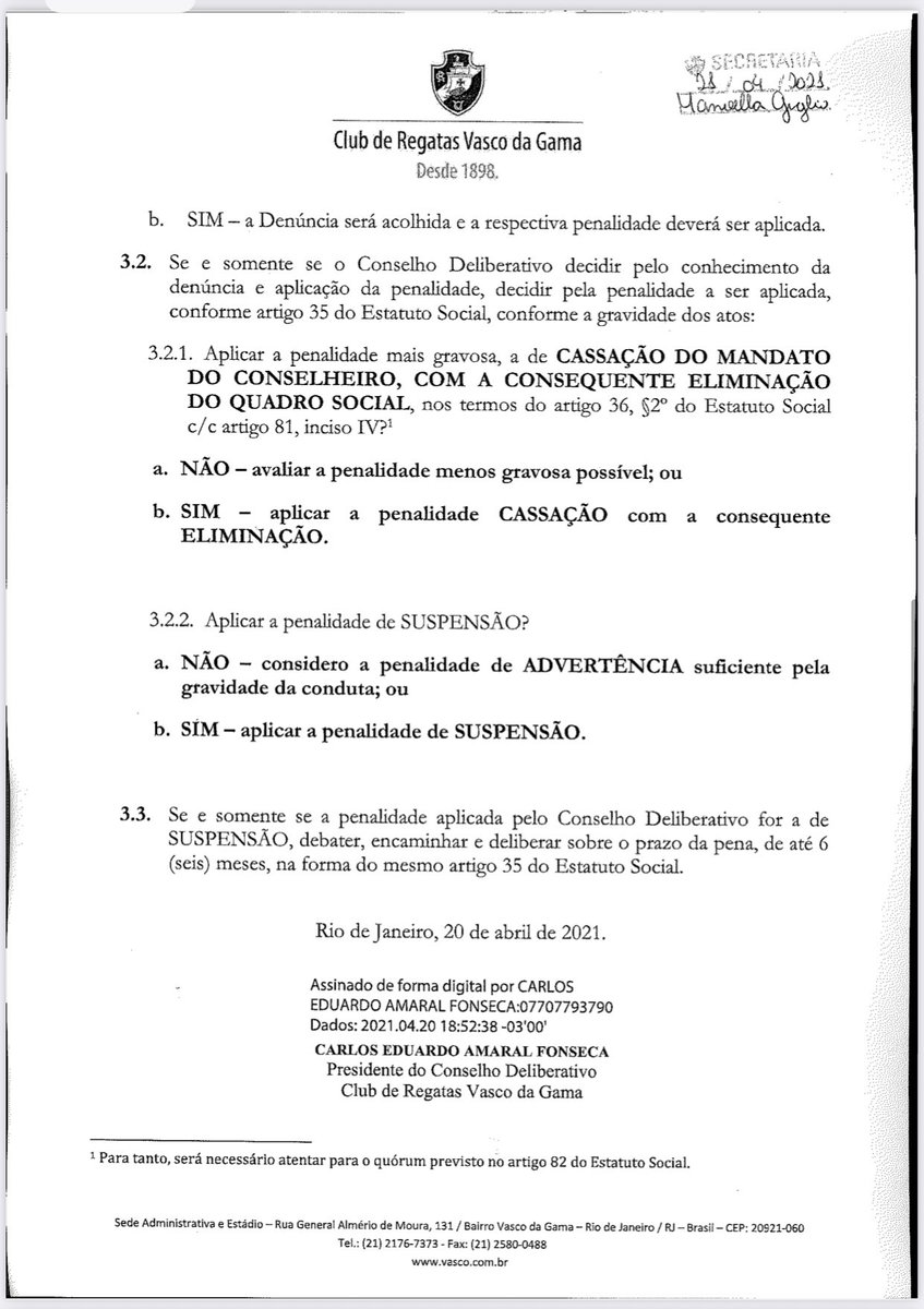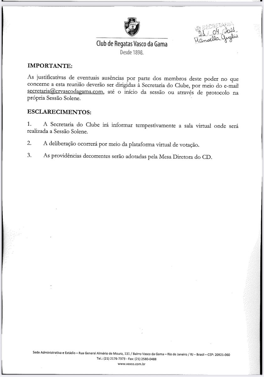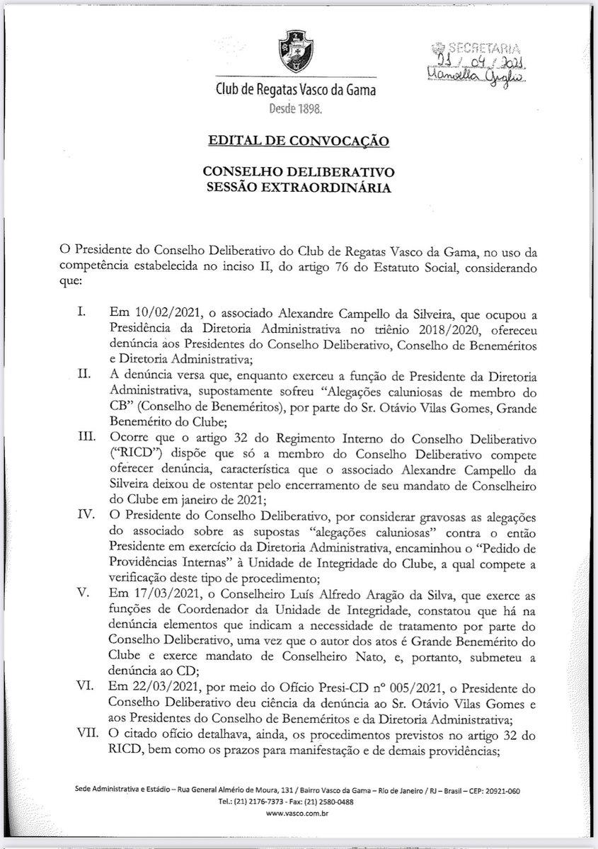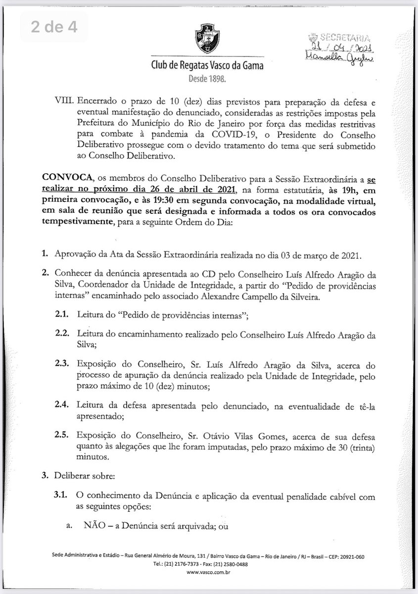 Presidente do CD do Vasco, Carlos Fonseca convocou uma reunião do órgão para o próximo dia 26 com o intuito de deliberar sobre uma denúncia do ex-presidente da DA, Alexandre Campello, envolvendo o conselheiro Otávio Gomes