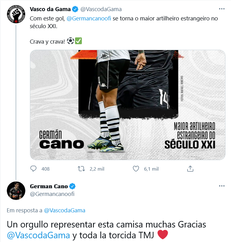 Fonte: Twitter oficial do Vasco, Twitter do jogador Germán Cano
