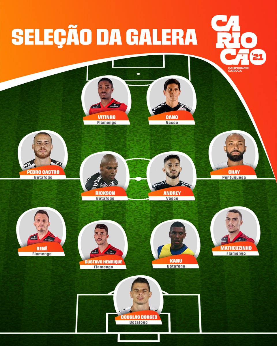 Assim ficou definida a última #SeleçãoDaGalera da Taça Guanabara! Destaques pro @Flamengo, campeão, e pro @Botafogo, que aplicou uma goleada no último jogo da rodada, colocando quatro jogadores cada!