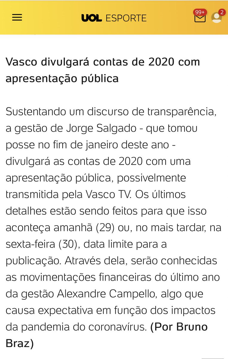 Na coluna "De Primeira", do @UOLEsporte , trouxemos detalhes da prestação de contas de 2020 do Vasco que precisa ser feita até esta sexta-feira (30). Veja na imagem abaixo: