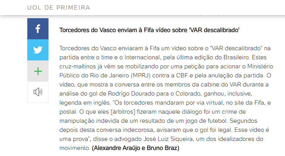 Na coluna 'UOL De Primeira' de ontem, mostramos que vascaínos enviaram à Fifa um material denunciando o 'VAR descalibrado' no duelo com o Internacional, pela última edição do Brasileiro (com @brazbruno)