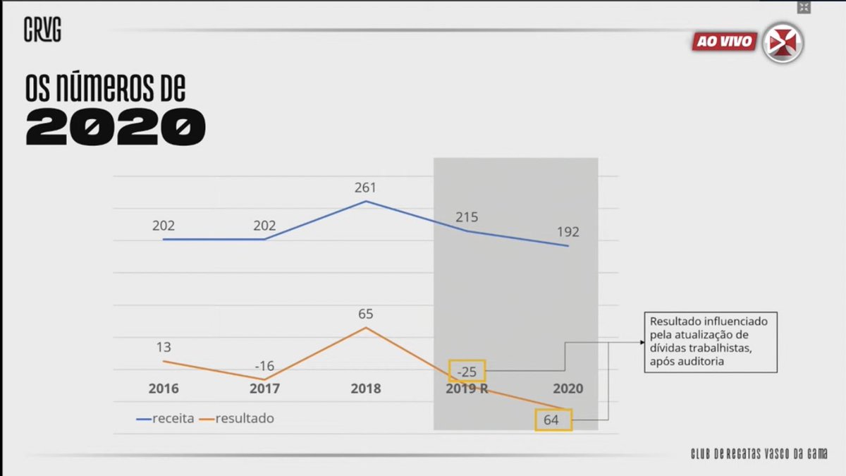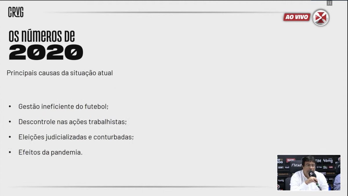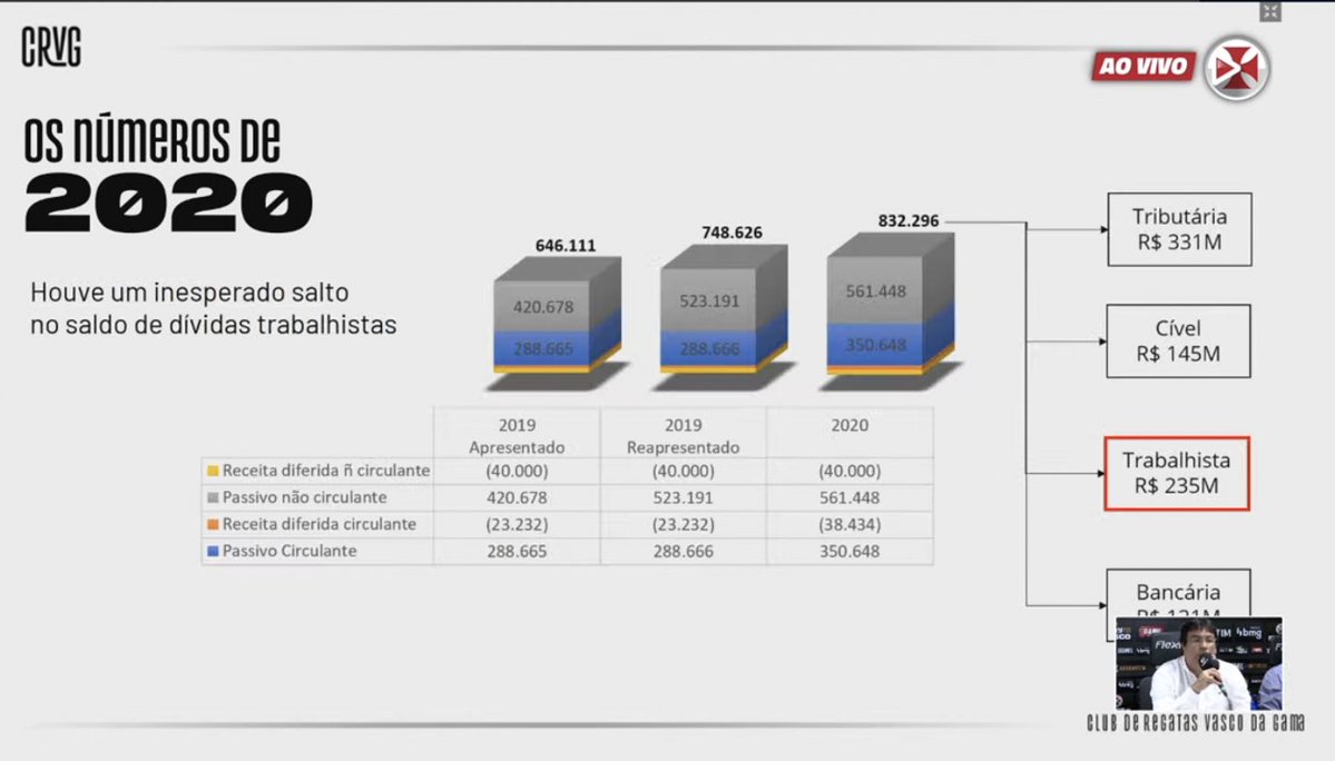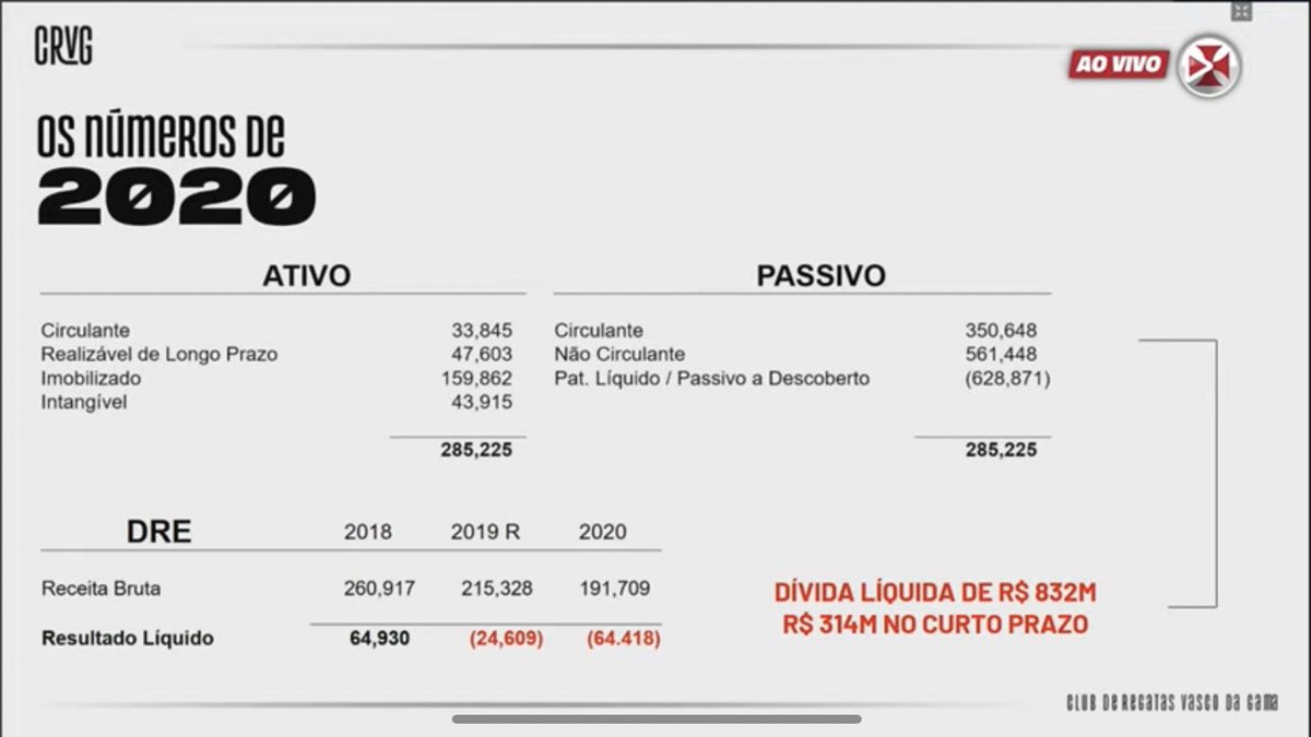 Entrevista coletiva finalizada. Balanço apresentado e o Vasco está com uma dúvida de R$ 832M, sendo 314M de curto prazo. Gestão de futebol, queda à Série B, política e pandemia foram os fatores, na visão da gestão atual, para o aumento do passivo.