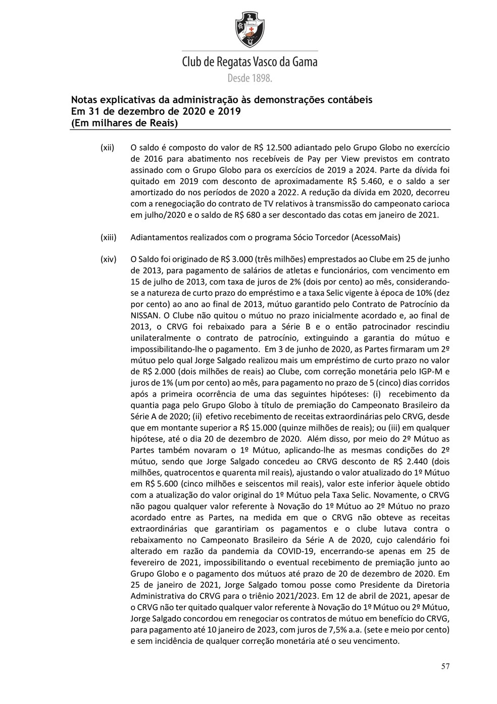 O presidente do Vasco, Jorge Salgado, colocou em balanço, pela primeira vez, a identificação de dívida de antigos empréstimos realizados por ele ao clube, em 2013 e 2020 . O dirigente aceitou estender o prazo e receber uma antiga dívida, hoje estimada em cerca de R$ 7 milhões, até janeiro de 2023, no fim de seu mandato.