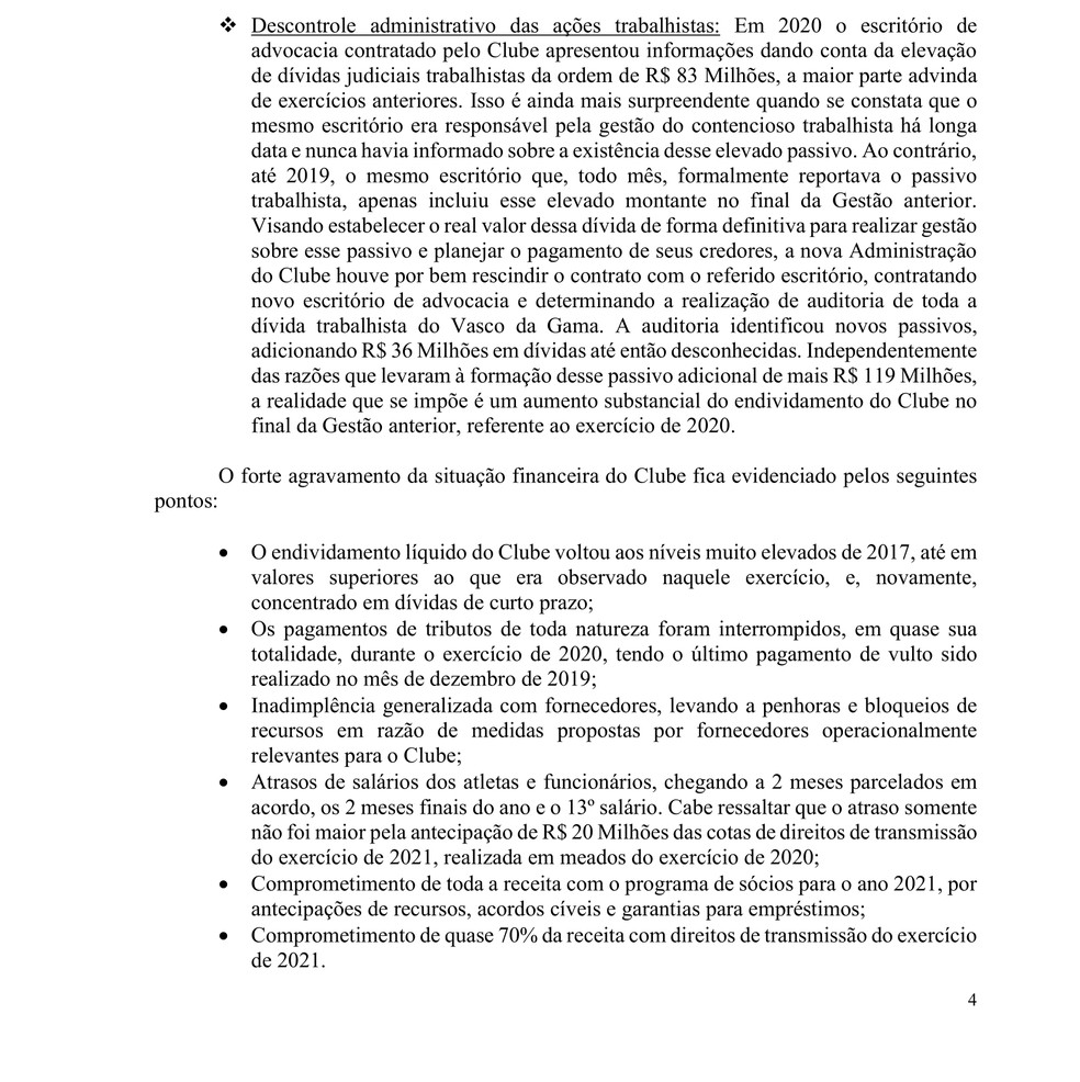 No balanço publicado em seu site no final da tarde desta sexta, o Vasco cita um "descontrole administrativo das ações trabalhistas" e alega que, no ano passado, o escritório de advocacia apresentou informações dando conta da elevação de dívidas judiciais trabalhistas da ordem de R$ 83 milhões, a maior parte advinda de exercícios anteriores. No entanto, a Paulo Reis Advogados Associados era responsável pelas ações há muito tempo e, segundo o Vasco, só informou sobre o montante no fim da gestão de Alexandre Campello, o que surpreendeu a atual diretoria.