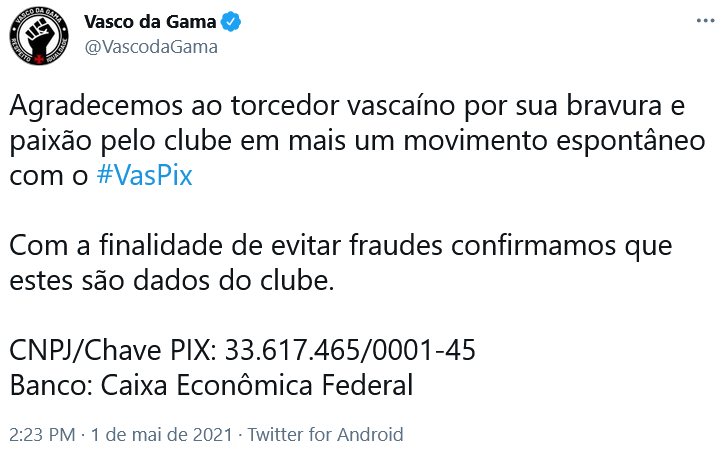 Fonte: Twitter oficial do Vasco