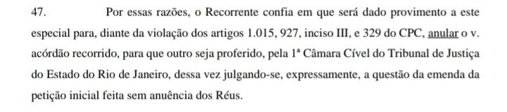 Defendeu Leven Siano na argumentação: "Portanto, encontram-se violadas as normas dos artigos 1.015, 927, inciso III, e 329 do CPC, impondo-se a anulação do v. acórdão recorrido, para que essa questão, relativamente ao pedido de tutela antecipada formulado por emenda da inicial feita sem a anuência dos Réus, seja julgada pelo Tribunal de segunda instância".