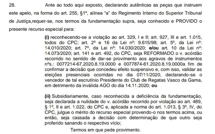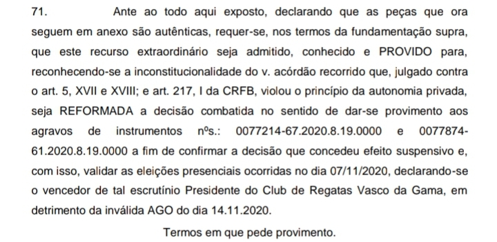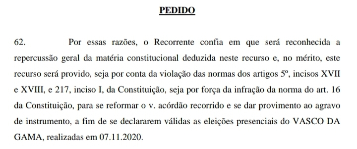 "Ou seja, não faz sentido, nem é hipótese para cabimento da tese da derrotabilidade, invalidar eleições presenciais do VASCO DA GAMA por meio de interpretação equivocada do art. 22, inciso IV, da Lei 9.615/1998, violando-se a autonomia das entidades desportivas, ao passo que, no mesmo local, com mais eleitores, no mesmo momento da pandemia, se realizaram as eleições municipais de 2020". Além disto, foi alegado violação ao artigo 16 da Constituição.