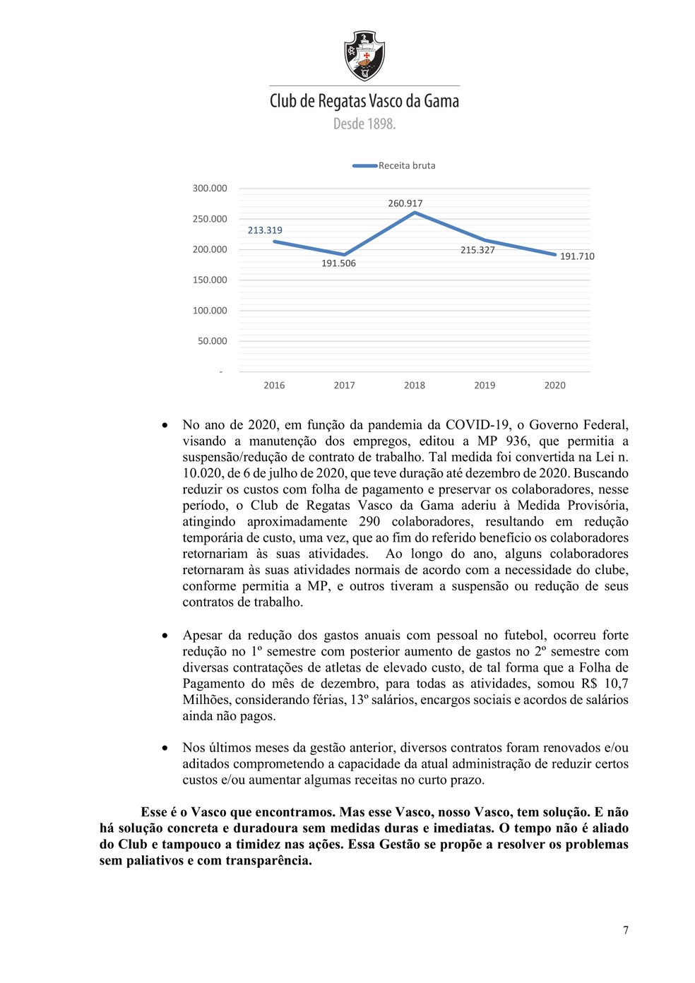 Na carta anexada ao balanço patrimonial divulgado no último dia 30, a diretoria administrativa do Vasco afirmou ter recebido o clube, envolvendo futebol e demais áreas, com folha salarial de R$ 10,7 milhões e que o objetivo é reduzi-la para um teto de R$ 5 milhões.