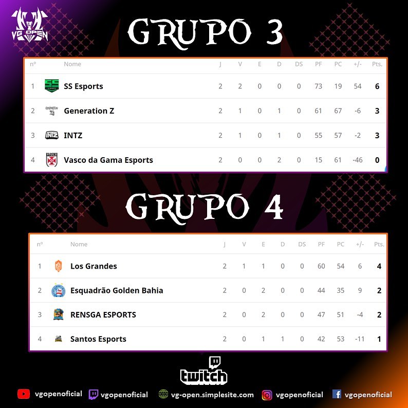 E assim terminou a classificação dos grupos 3 e 4 da Divisão Elite do campeonato de #wildrift do VG OPEN após a rodada deste final de semana. @ssofc_ e @genz.wr estão liderando o grupo 3 seguidos de @intzesports e @vasco.esports .