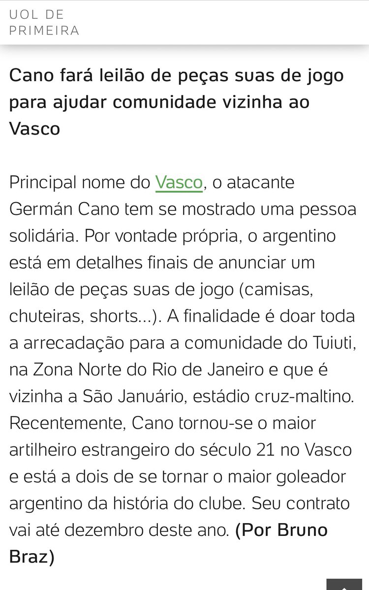 Pessoal, hoje na coluna "De Primeira" divulgamos que Germán Cano organizou um leilão, por vontade própria, para ajudar a comunidade do Tuiuti, que é próxima a São Januário ? (1/2)