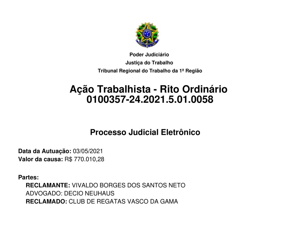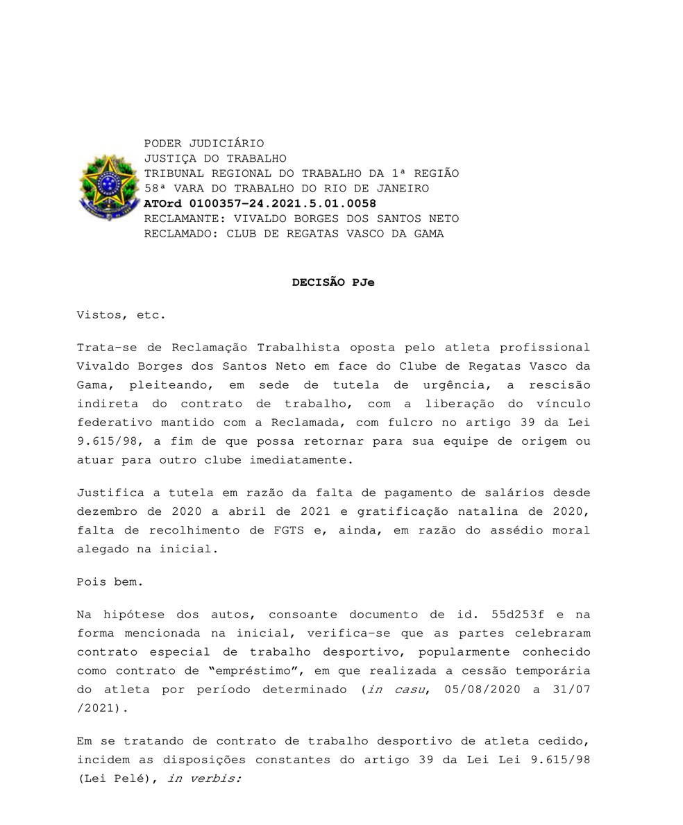 O lateral-esquerdo Neto Borges ingressou no Tribunal Regional do Trabalho (TRT-1) com pedido de rescisão de contrato com o Vasco, que é válido até 31 de julho de 2021 - ele está emprestado pelo Genk-BEL. O pleito é apoiado no artigo 39 da Lei Pelé. Além do distrato, Neto pede R$ 770.010,28 alegando não receber salários desde dezembro de 2020, gratificação natalina, e ter sofrido assédio moral. A notícia foi publicada inicialmente pelo portal "Esporte News Mundo".
