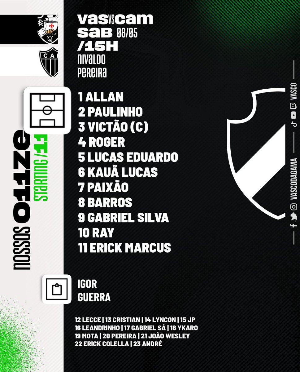 Vasco escalado para a estreia diante do Atlético-MG no Brasileiro sub-17. As equipes entram em campo às 15h, com transmissão do Mycujoo. #BaseForte #RaizÉSerVasco