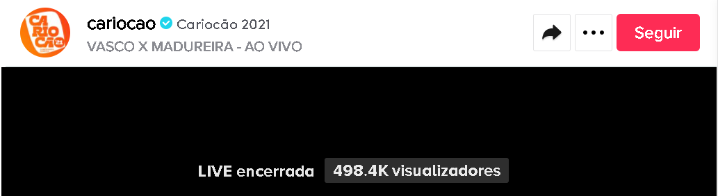O jogo da volta da semifinal da Taça Rio entre Vasco x Madureira, que foi transmitido ao vivo pelo TikTok oficial do Cariocão, teve quase 500 mil visualizações durante a transmissão.