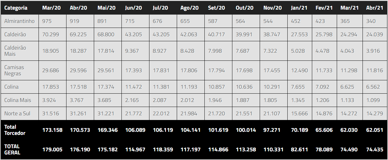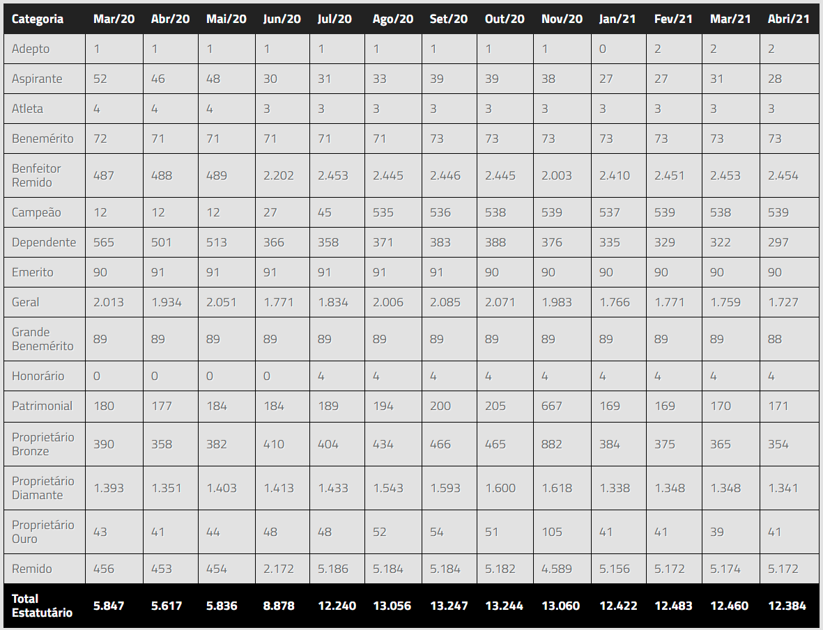 Veja abaixo a quantidade de sócios ativos no Gigante por categoria.