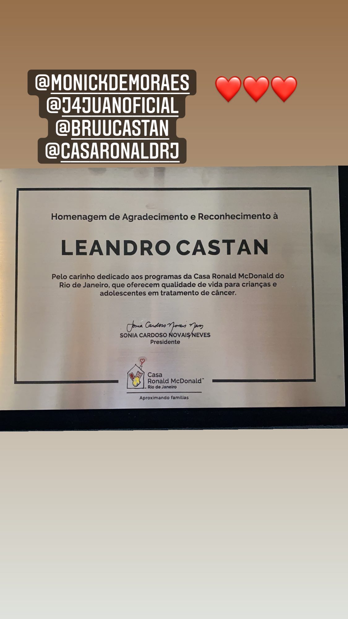 Leandro Castan recebe placa de agradecimento da Casa Ronald McDonald