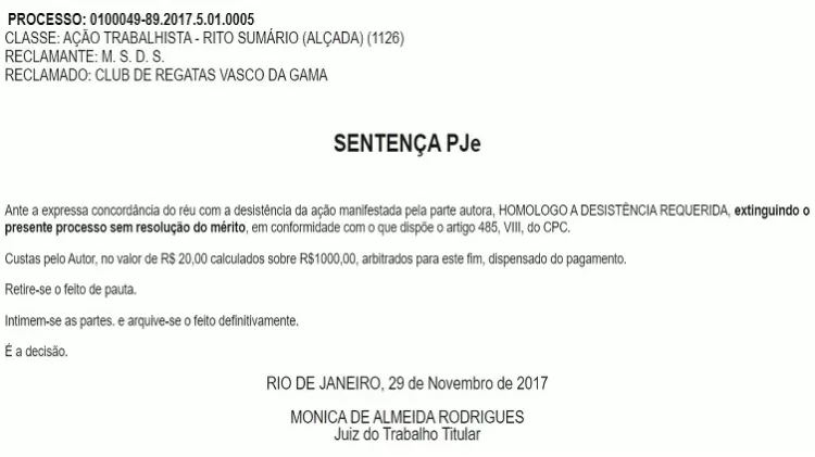 "Desisti do processo porque não havia mais vínculo do Miguel com o Vasco. Eu já havia ganho uma liminar na Justiça que o Vasco nem sequer recorreu. Ele já estava até jogando no Fluminense. O Vasco não mostrou mais interesse. Para mim, o assunto estava encerrado, e por isso desisti da ação. Não estive em acordo nenhum".