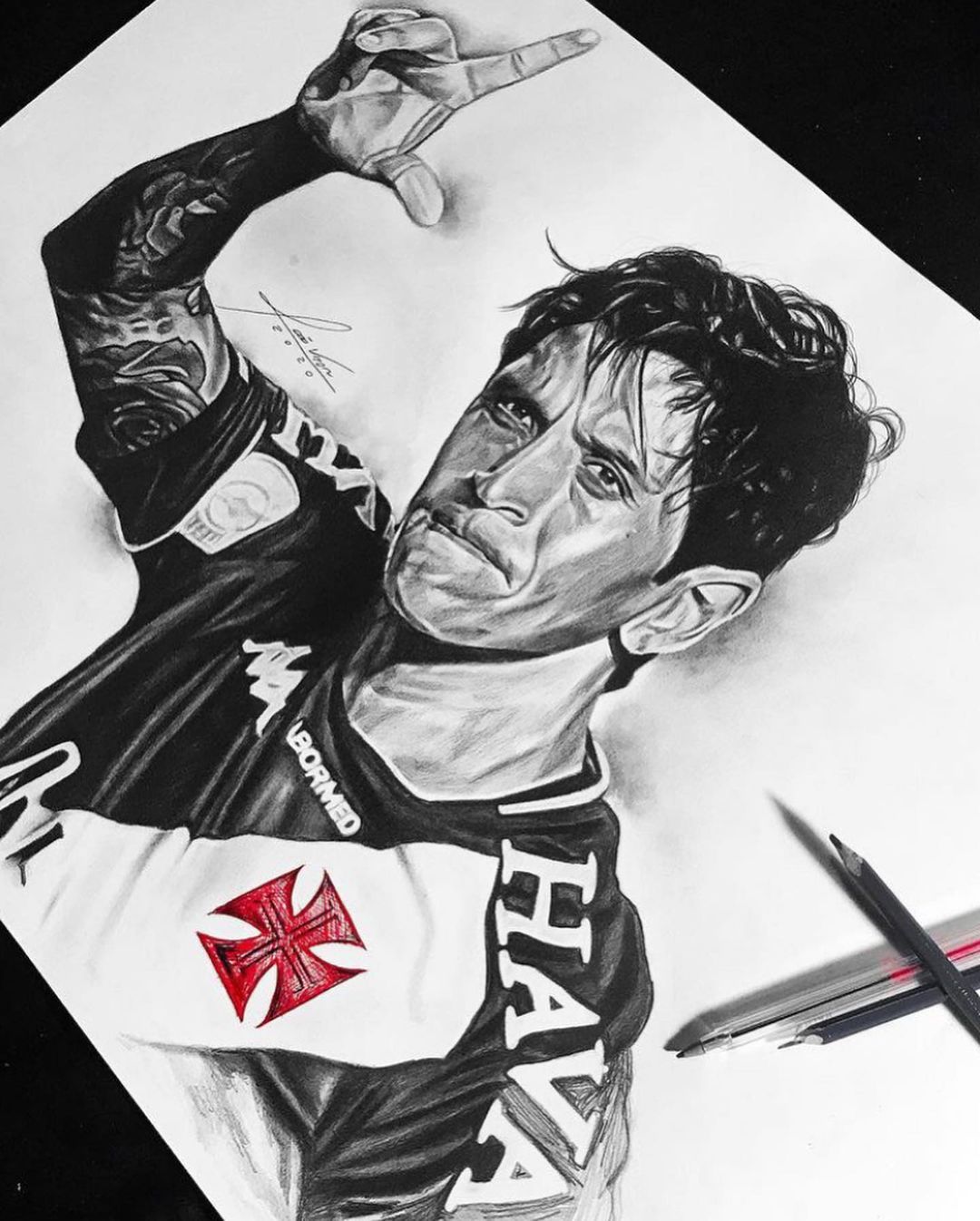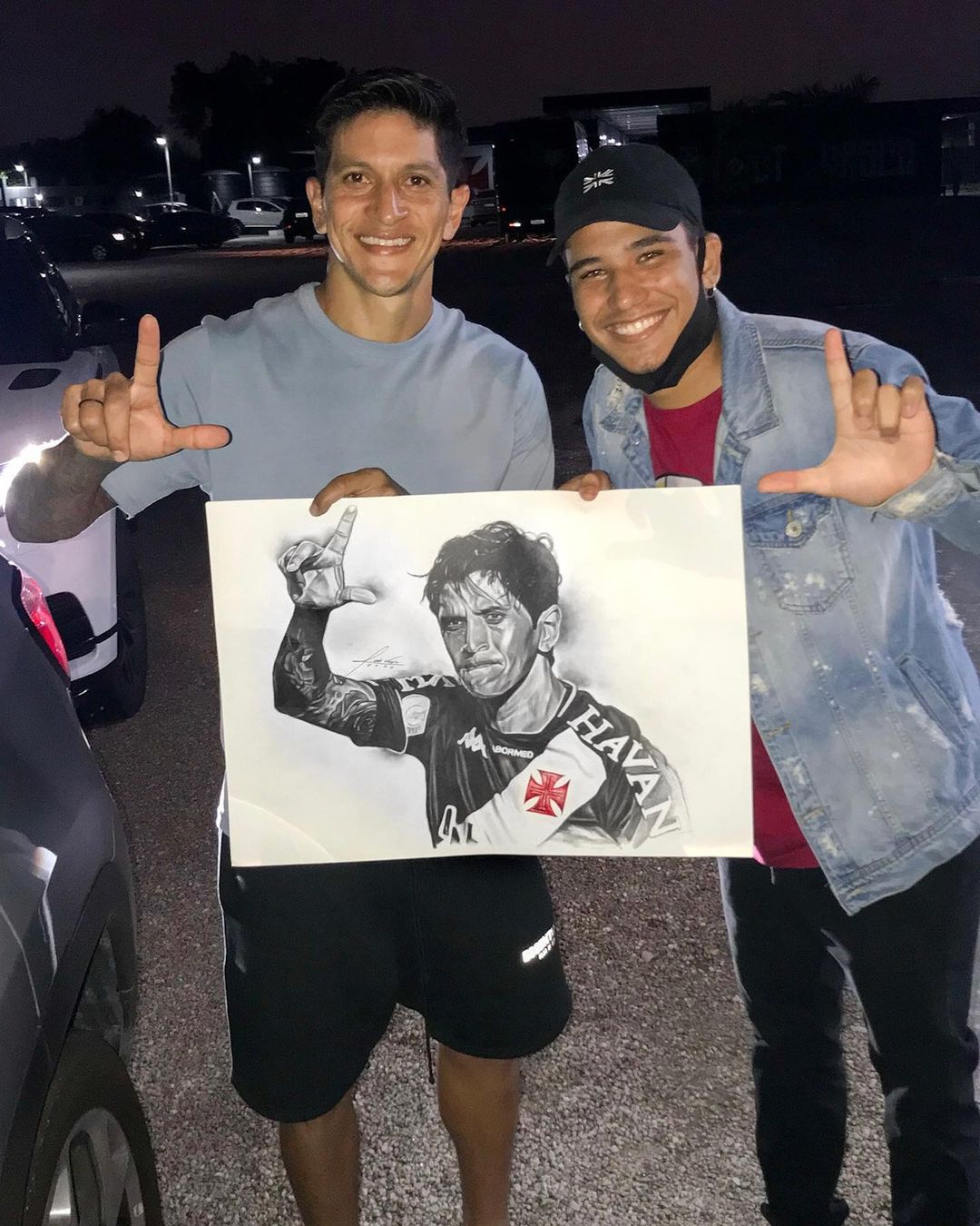 Artista entrega desenho para Germán Cano e faz o 'L' com o artilheiro vascaíno