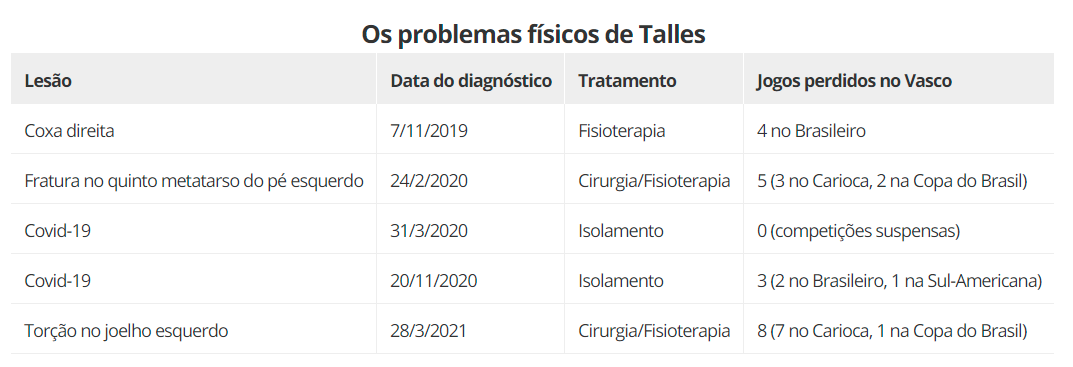 Desde que Vanderlei Luxemburgo observou a então promessa em um treino, decidiu puxá-la para o profissional e apostou nela para ajudar na luta contra o rebaixamento no Brasileirão 2019, Talles enfrentou dificuldades físicas. Foram duas cirurgias, uma lesão muscular e dois casos de contaminação pela Covid-19. Um total de 20 jogos perdidos no Vasco, em um intervalo de um ano e meio - número que aumentará caso ele não participe da final da Taça Rio.