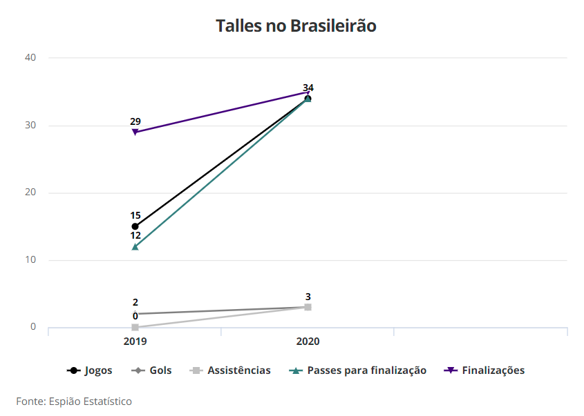 De acordo com o Espião Estatístico, ferramenta do ge, Talles fez um gol a cada 588 minutos no campeonato de 2019. No do ano seguinte, a relação aumentou a 822 minutos. O Sofascore, outra plataforma de estatísticas, mostra uma leve piora em um quesito forte do meia-atacante: a jogada individual.
