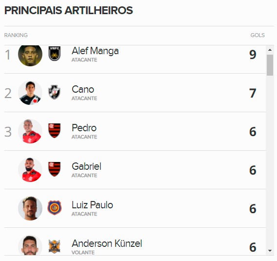 Com o gol marcado no 1º jogo da final da Taça Rio, Germán Cano assumiu a vice-liderança da artilharia do Estadual, com 7. O artilheiro é Alef Manga, do Volta Redonda, que não joga mais nesta edição do campeonato. Cano ainda terá o 2º jogo da decisão da Taça Rio para tentar aumentar seu número de gols na artilharia.