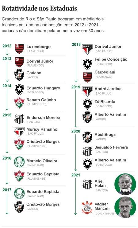 O mais recente caso foi o de Vagner Mancini, demitido pelo Corinthians depois da derrota para o Palmeiras no domingo. Antes dele, Ariel Holan pediu para sair do Santos, insatisfeito com a pressão tão precoce sobre seu trabalho. Somados os oito clubes, são 23 trocas de técnicos nos últimos dez anos, média de mais de dois por temporada.