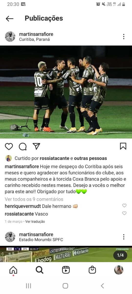 Rossi comenta 'Vasco' em post de despedida de Serrafiore do Coritiba
