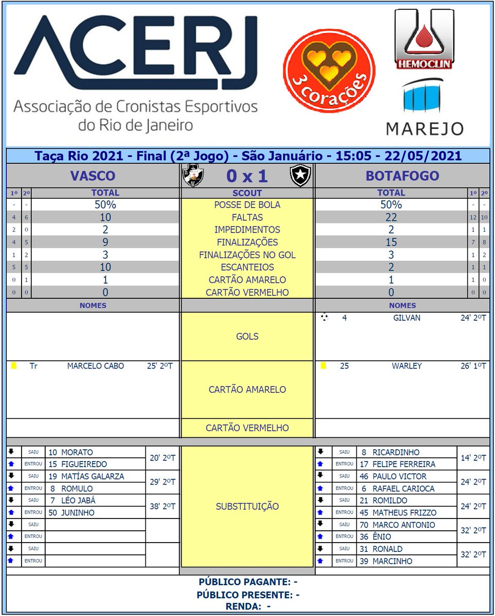 Fonte: O Dia (texto), Gazeta Esportiva (ficha, fotos), NETVASCO (ficha), Youtube Cariocão TV (vídeo), Twitter Acerj (estatísticas), Site oficial do Vasco (fotos), ge (fotos), Twitter TNT Sports Brasil (foto), Twitter do jornalista Fred Gomes/ge (fotos), Twitter Fim de Jogo (fotos), Twitter Bíblia Vascaína (foto), R7 (fotos)