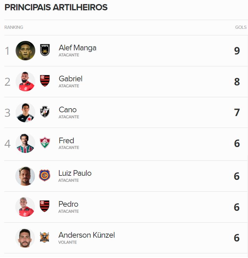 Com 7 gols marcados, o atacante vascaíno Germán Cano terminou o Campeonato Estadual em 3º lugar na artilharia. Confira as principais posições: