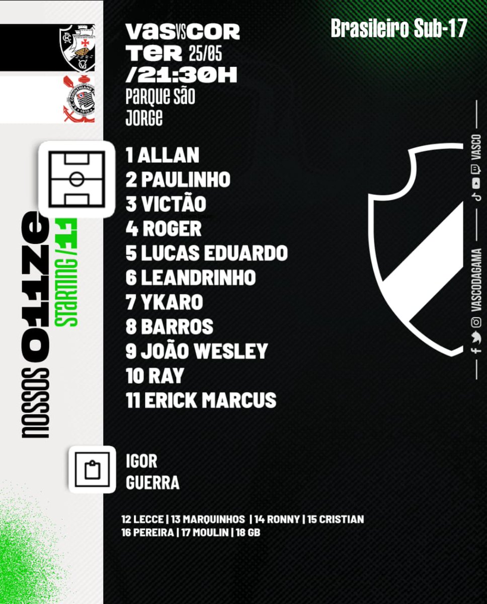 Juvenil: Confira a escalação do Vasco para o jogo contra o Corinthians