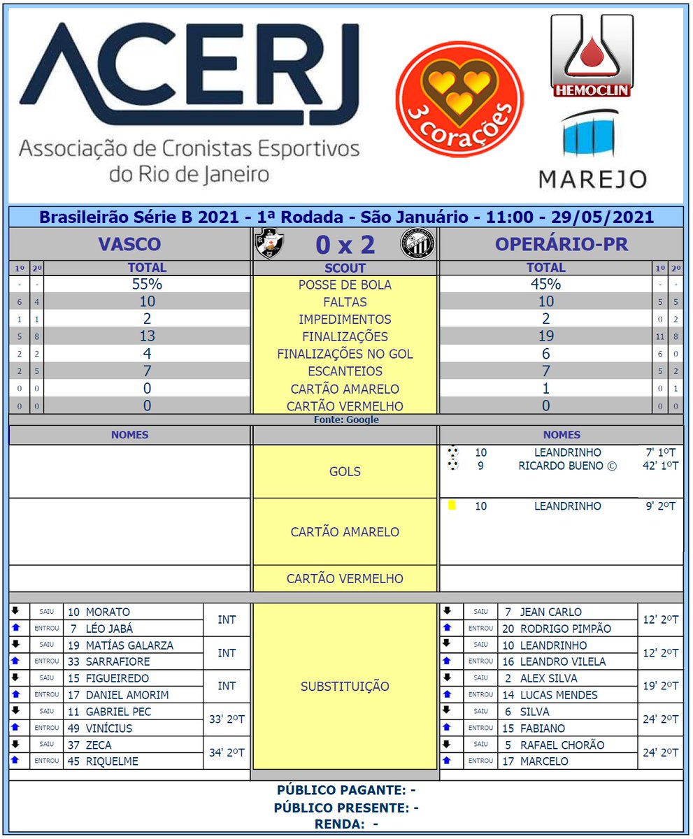 A primeira chance de perigo do Vasco aconteceu apenas aos 40 minutos. Figueiredo emendou rasteiro, mas Simão fez defesa difícil. O Operário voltou a castigar o clube carioca. Andrey errou passe e deu presente para Jean Carlo. Ele logo lançou Ricardo Bueno. O centroavante deu uma toque por cima e fez 2 a 0, aos 42 minutos.