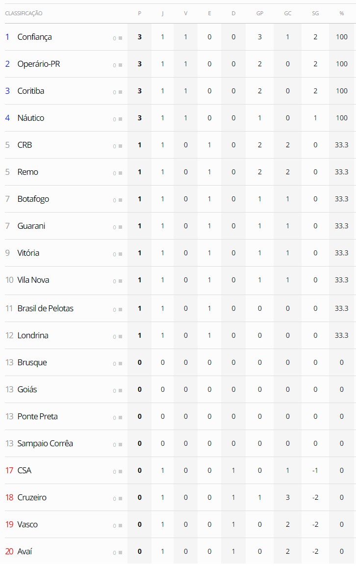 Terminados os jogos de sábado da 1ª rodada da Série B, o Vasco, que perdeu para o Operário-PR por 2 a 0, iniciou a campanha na competição na 19ª colocação da tabela. A diferença entre Vasco e Avaí está no número de cartões amarelos. Enquanto o Vasco teve apenas 1 cartão para o auxiliar técnico, os catarinenses tiveram 3 jogadores advertidos na partida contra o Coritiba.