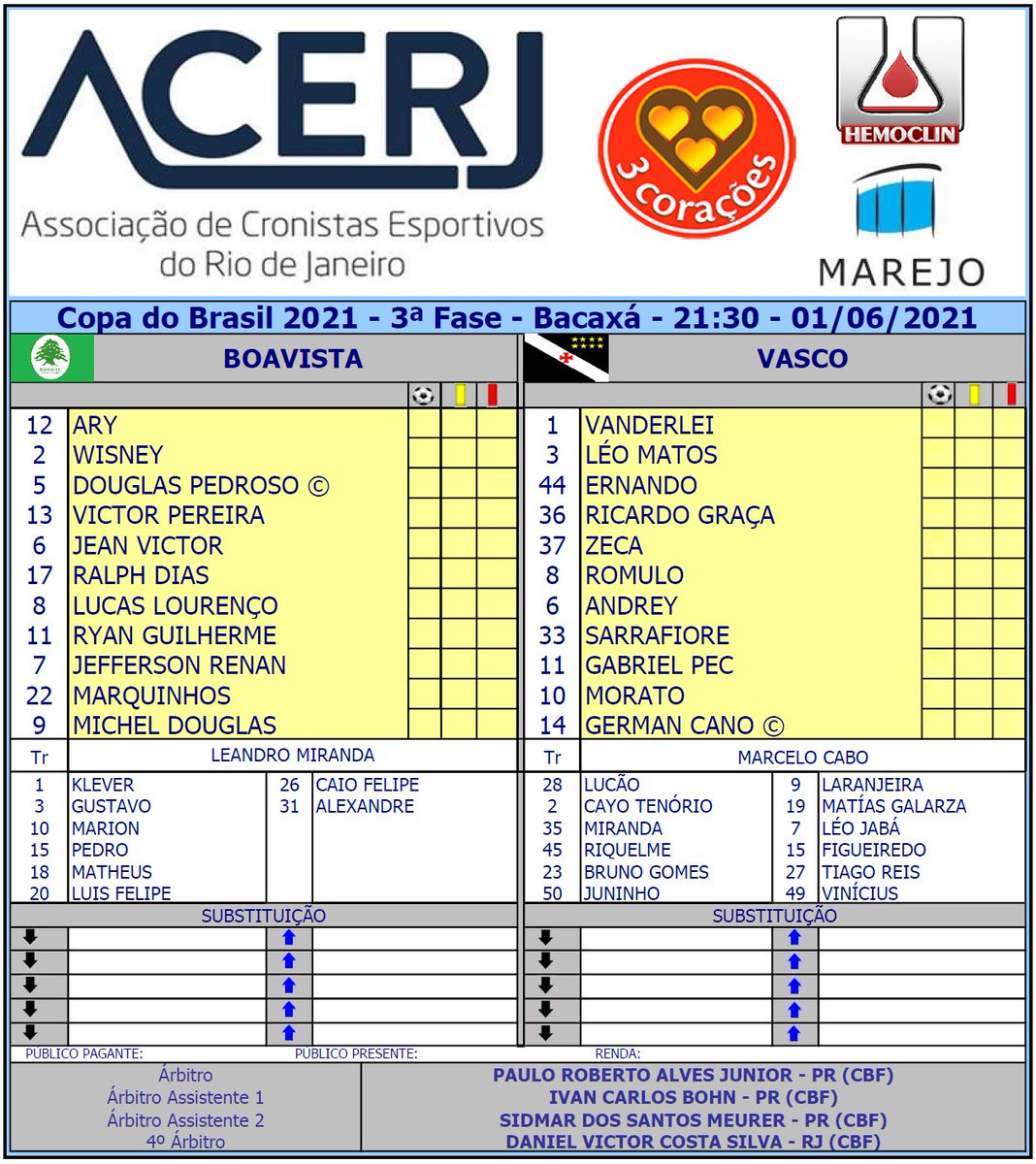 Escalações de Boavista e Vasco pelo jogo de Ida da 3ª Fase da Copa do Brasil 2021 em Bacaxá #CopaIntelbrasDoBrasil #acerjinforma #BVTxVAS #Vasco #boavista