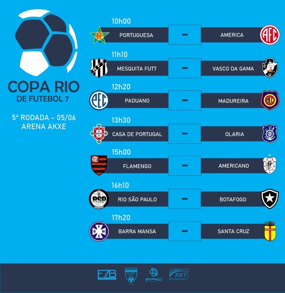 No Rio de Janeiro, a quinta rodada da Copa Rio vai movimentar a Arena Akxe no próximo sábado (05). Serão sete jogos transmitidos AO VIVO pela F7TV Play.