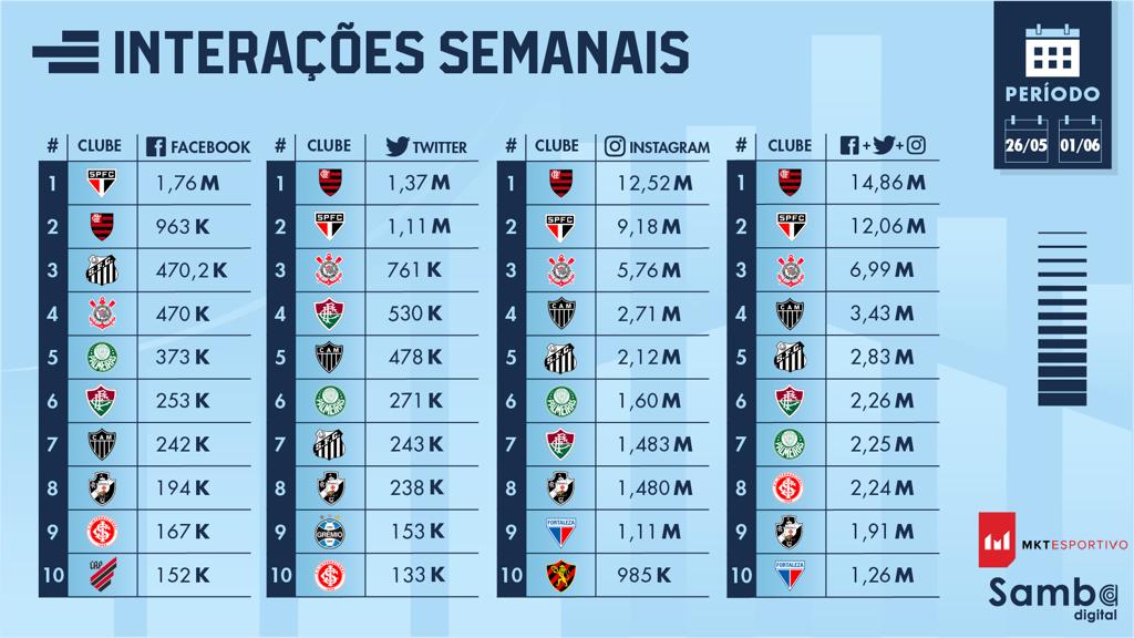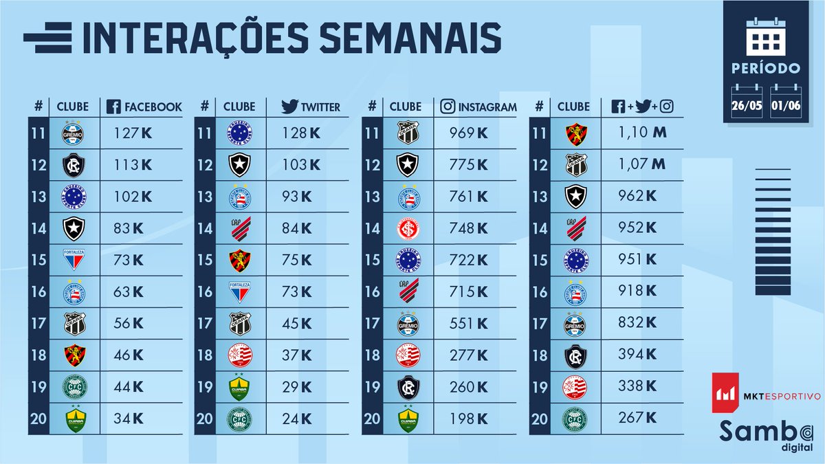 Na parte de baixo do ranking, o @Gremio despencou 75% no total de interações na última semana. Destaque para um preocupante 17° lugar no Instagram.