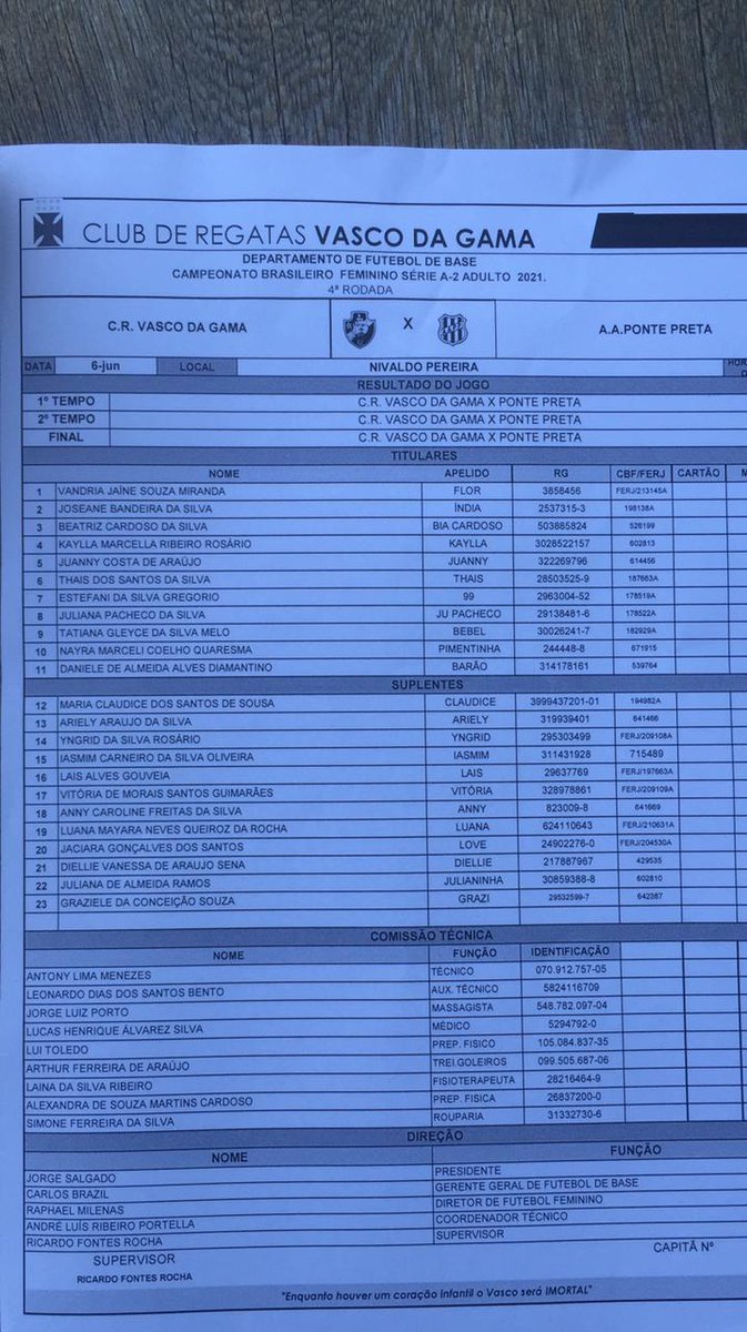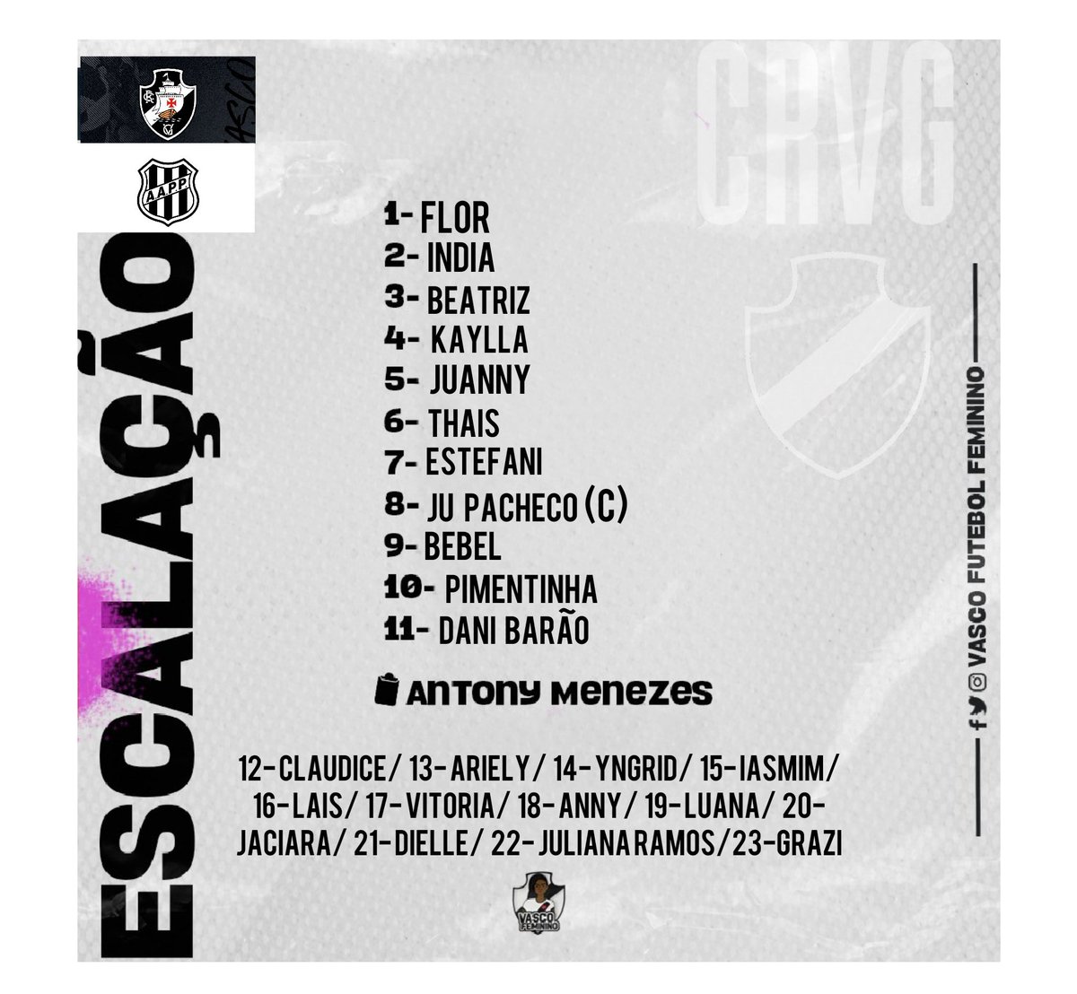 Feminino: Veja a escalação do Vasco para o jogo contra a Ponte Preta