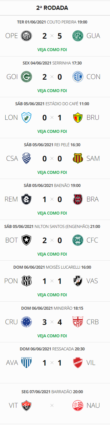 Terminados os jogos de domingo da 2ª rodada da Série B, o Vasco, que empatou com a Ponte Preta por 1 a 1, está na 18ª colocação. Na noite desta segunda-feira, o jogo Vitória x Náutico fecha a rodada.
