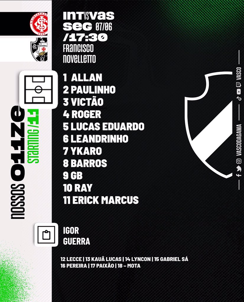 Juvenil: Confira a escalação do Vasco para o jogo contra o Internacional
